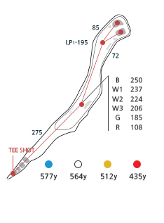 좌측은 OB이고, 티샷은 벙커 좌측방향으로공략합니다. (우측으로는 벙커가 있어 주의해야 합니다.) 티샷이 슬라이스로 인해 12번홀로 볼이 넘어갈 경우 12번홀 그 자리에서 치시면 되고, 세컨샷할 때 우측 100 ~ 140야드 지점의 해저드가 있어 주의해야 합니다.