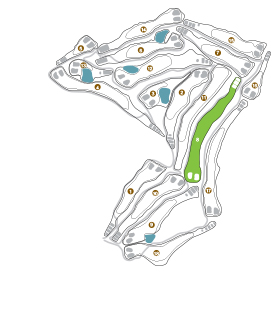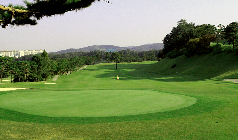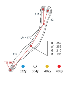 좌,우측OB이며OB특설티가 설치되어 있습니다. 티샷은 가운데 나무를 보고 공략합니다. 우그린 사용시 투 온도 가능합니다. 세컨샷은 슬라이드를 조심해야 하며, 좌측 언덕을 보고 공략합니다. 글라스 벙커가 있는 홀입니다. 특히 우측을 경계하여 플레이 하면 무난한 홀입니다.