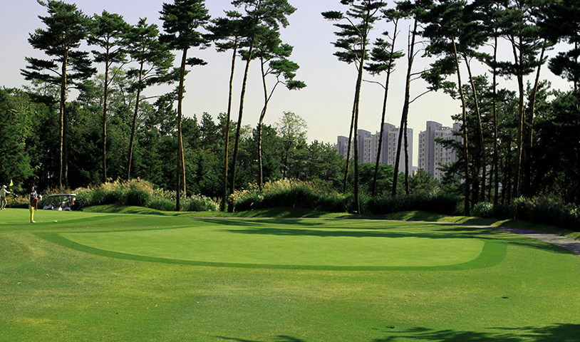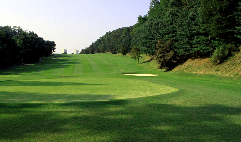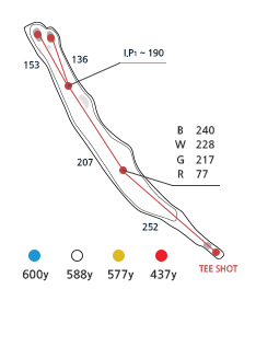 좌우측 OB이며 티샷은 약간 좌측으로 공략합니다. 세컨샷은 볼의 낙하지점에서 우측으로 바운드가 되므로 좌측으로 공략하는 것이 유리합니다. 그린과 그린 사이앞 벙커를 조심하여야 하며, 좌그린 앞측 벙커도 주의해야 합니다. 봄이면 진달래꽃이 아지랑이와 어우러져 봄을 알립니다. 겨울이면 토끼와 고라니 꿩 등을 볼 수 있으며 꿩이 울부짖는 소리에 한번 더 뒤돌아보게 하는 홀입니다.