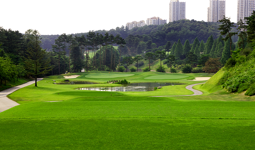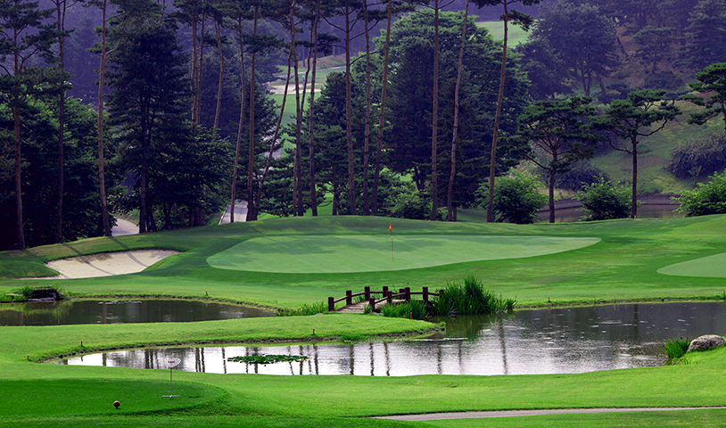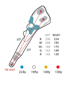 우측은 신코스 4홀 페어웨이로 완전히 넘어가면 OB언덕 중간에 걸리면 그냥 쳐야합니다. 2009년 새로만든 해저드에 다리가 있어 티잉그라운드에서 내려다 보면 적송과 억새가 어우러져 운치가 있으며 청둥오리가 무리를 이룰때면 아름다운 모습 또한 볼 수 있는 파3홀입니다.